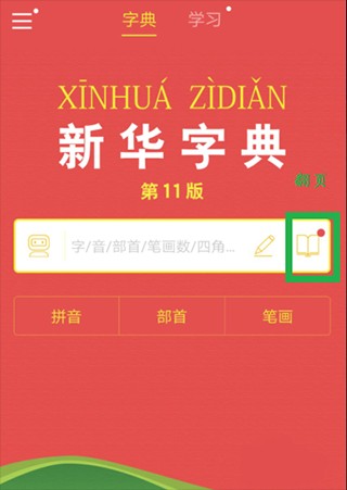 1、打开新华字典界面后,在白色输入框的右侧能看到一个书本形状的黄色小图标,点击这个图标就能直接在屏幕上实现翻页操作。