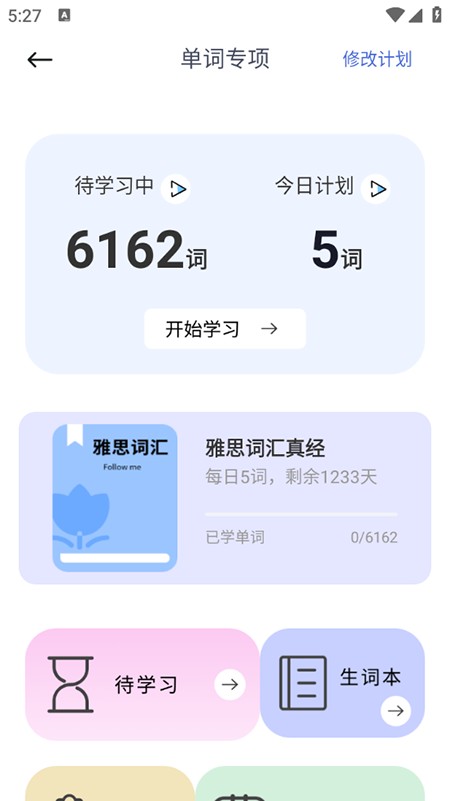4、学习计划与记录:支持用户指定个性化学习计划,能够根据用户英语水平动态调整,让用户时刻保持最佳学习难度梯度。