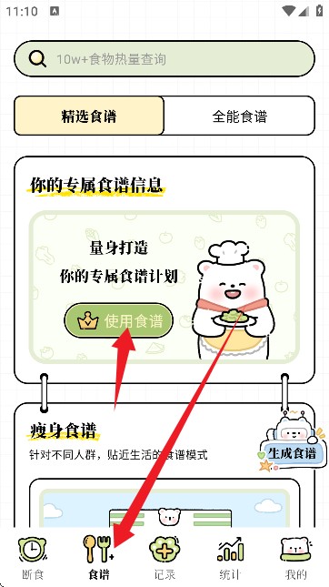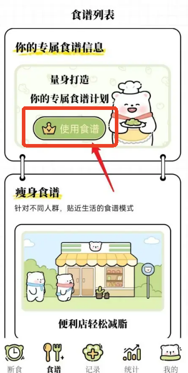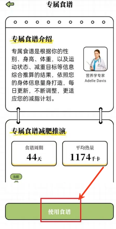 3、在已选定的食谱卡片里,点击【使用食谱】按钮,就能把该食谱设为当日的饮食计划。设置完成后,系统会自动记录下食谱的状态,方便后续进行跟踪和管理。