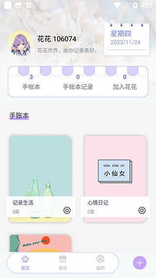 2、在首页点击已有手帐本或右下角“+”按钮新建手帐本;