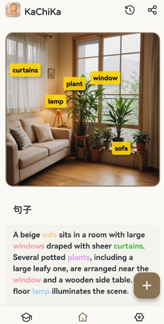 1、KaChiKa能够依据图片内容自动生成对应的外语单词和实用例句,所有单词标签都可点击发音,以此为学习者和用户构建沉浸式的学习体验。