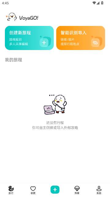 1、打开VoyaGO应用,在旅行页面找到并点击“创建新旅程”选项