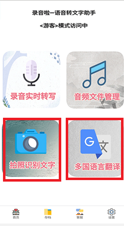 -点击首页功能图标“拍照识别”或“多语翻译”;