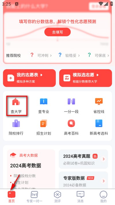 1、打开阳光高考网的首页,找到并点击软件里的【查大学】功能入口