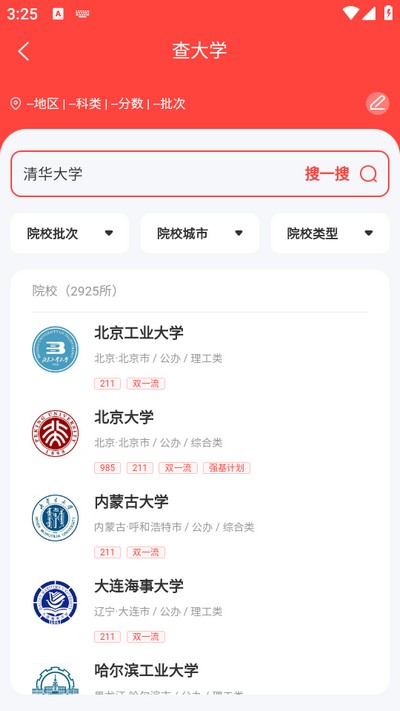2、用户可在搜索框内输入想要查询的大学名称,点击【搜一搜】按钮后,系统便会展示对应的搜索结果。
