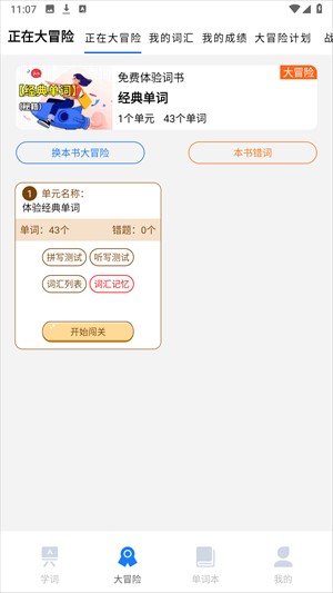 2、进入【大冒险】板块,用户还能直接开启单词大闯关模式。