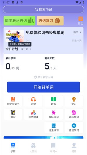 1、打开巧学背单词应用,进入【学词】界面后,用户能够使用丰富多样的功能。