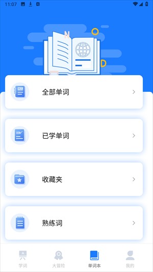 3、进入【单词本】界面后,用户能够在此直接进行单词背诵。