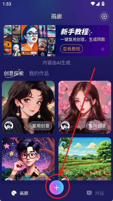 1、打开Midjourney绘画,点击首页底部的【+】号按钮,进入创作页面。