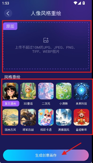 支持用户上传你想要绘制的参考图,选择你想要的生成图片,点击“生成创意画作”等待AI算法生成,用户就能看到自己想要模仿复刻的精美作品,惟妙惟肖,鬼斧神工。