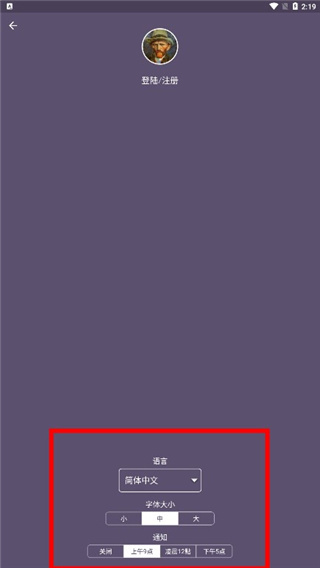 5、若用户进入时一开始忘记选择语言,在这里也能进行选择,同时还可以设置字体大小、通知时间等相关选项。