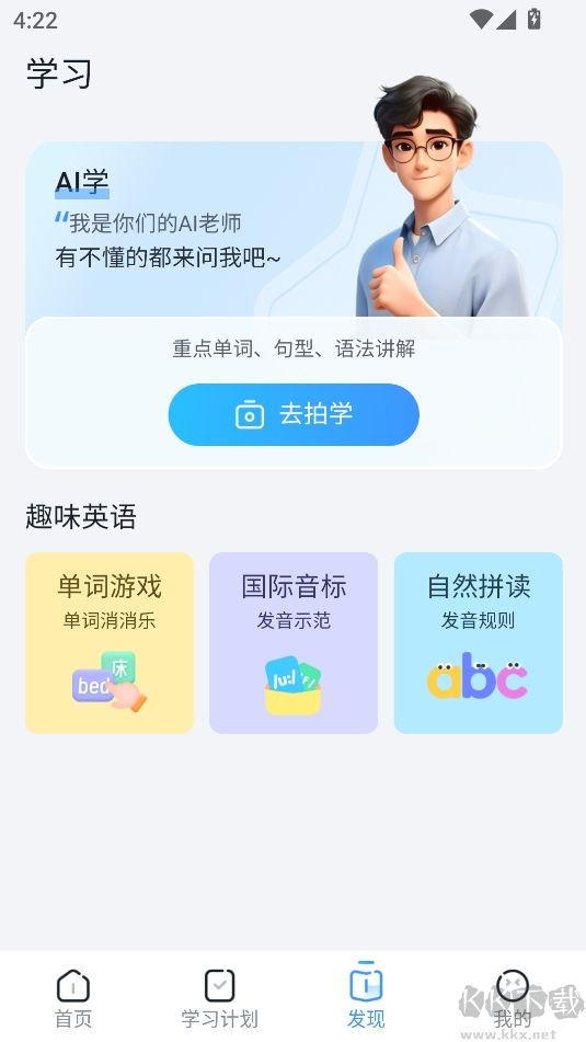 一款名为AI超级单词王的工具配备了会变化的单词卡片,当用户点击卡片上猫咪造型的耳朵部分时,就能启动单词发音的趣味互动环节。