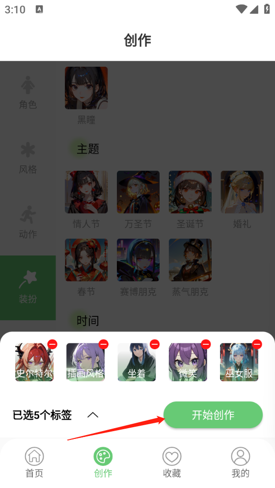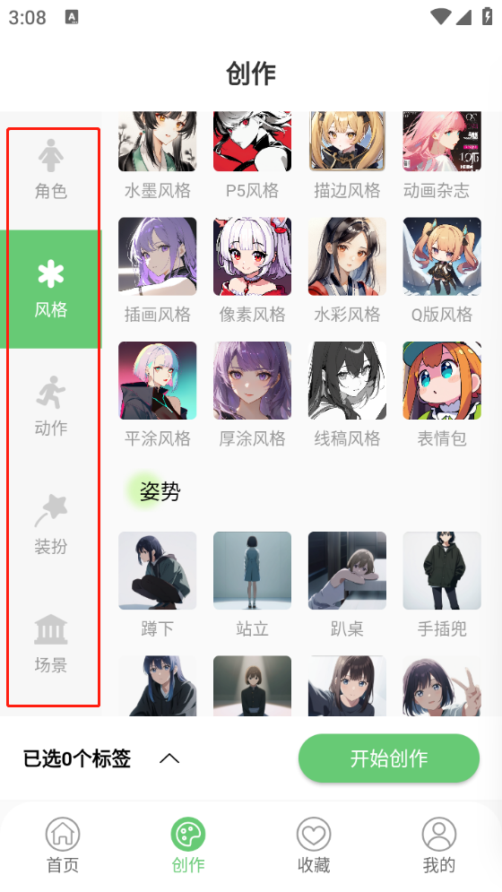 1、打开后,点击底部栏里的“创作”按钮。在左侧的栏目中,用户能够挑选角色、风格、动作和装扮之类的标签来完成设置。