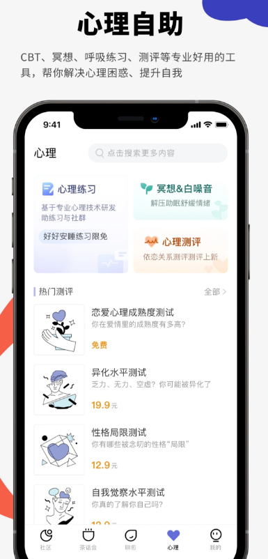 我们提供借助CBT(认知行为疗法)、冥想、心理测评等科学手段打造的自助练习工具,助力用户调节情绪、增强自尊、缓解焦虑、优化依恋模式等。