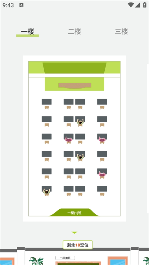 3、点击进入学习楼,该楼共有三层,每层各班级的剩余座位数会清晰显示,点击右下角按钮即可一键完成选座操作。