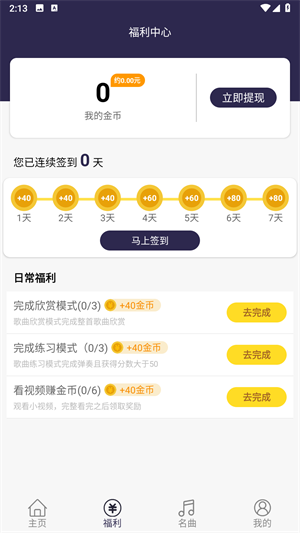 2、进入福利专区后,可通过签到获取金币,这些金币支持直接提现。