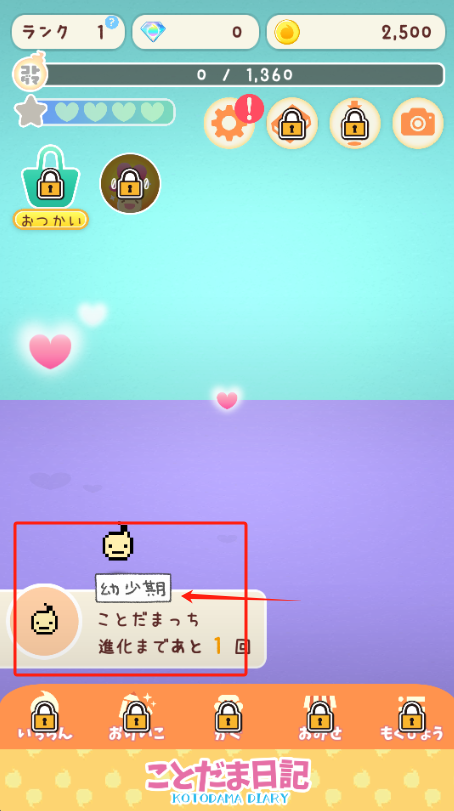 1、点红框里的幼少期角色,看它进化还需要1次互动,爱心代表亲密度。