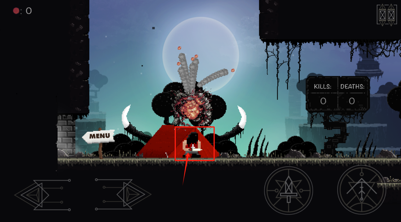 2、操控角色攻击怪物,左上角可查看菜单,当前击杀次数与死亡次数均为零。