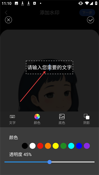 4、在文字输入框中填写所需文字,可对颜色、透明度等参数进行调整,设置完成后确认即可。