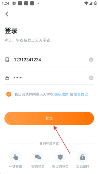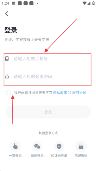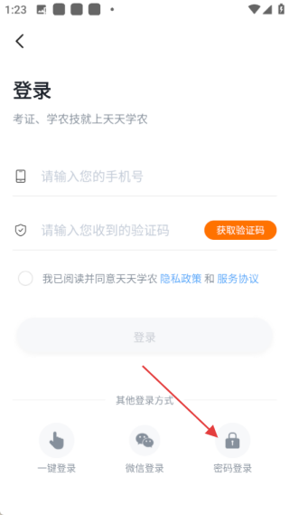 3、进入密码登录界面后,填写手机号与密码,并勾选对应的协议选项。