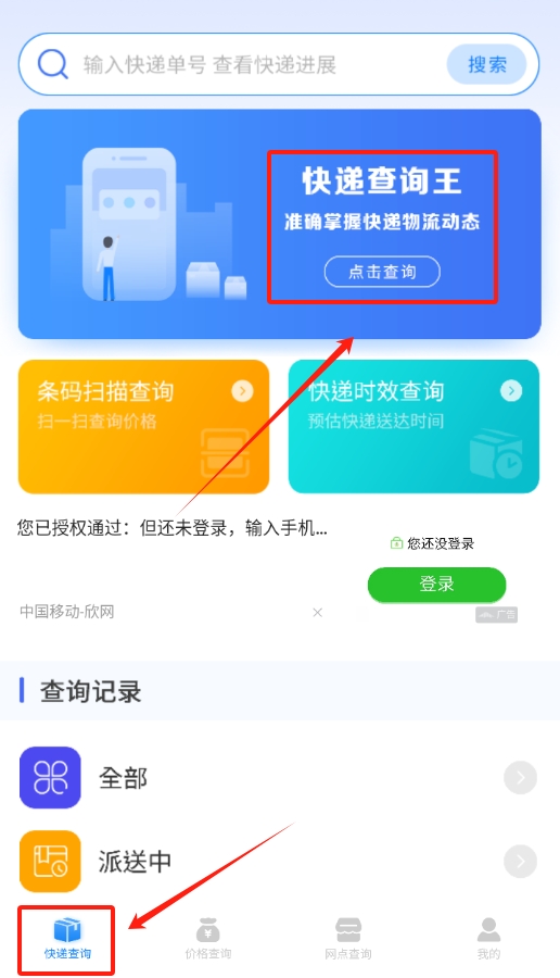 1、打开快递单号查询软件,在首页找到“查询快递”按钮,点击进入。