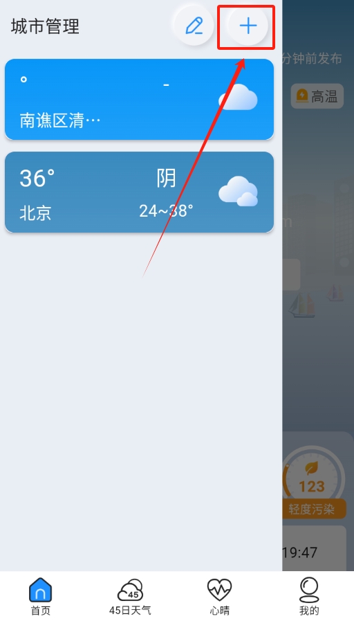 2、在弹出的菜单中,点击右上方的加号按钮,即可准备输入你想要关注的地点。