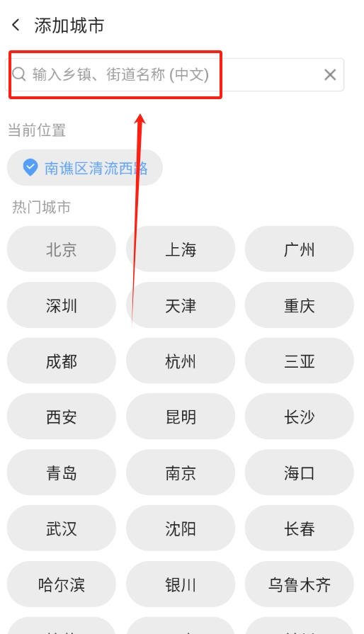 3、在搜索框中输入城市名称,输入完成后点击确定,该城市的天气信息就会添加到你的列表中。