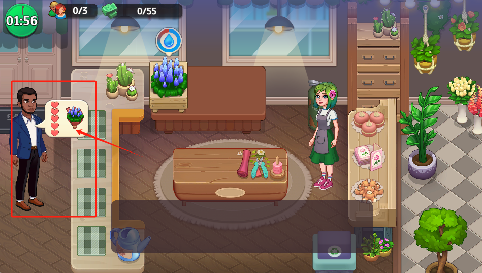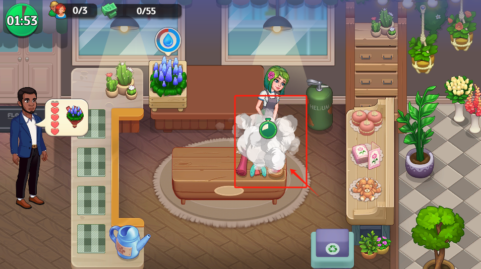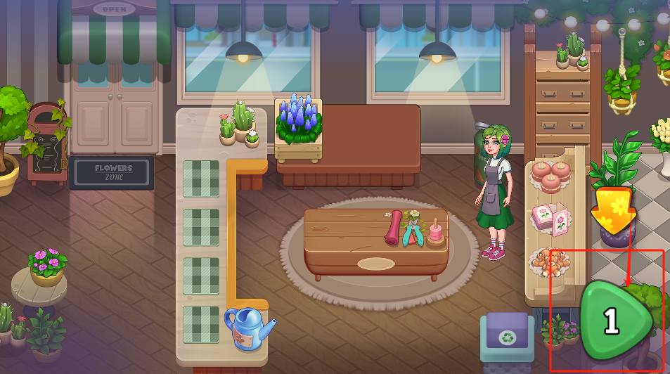 1、点击绿色数字1按钮,帮花店女孩整理绿植,摆放鲜花装饰店铺。