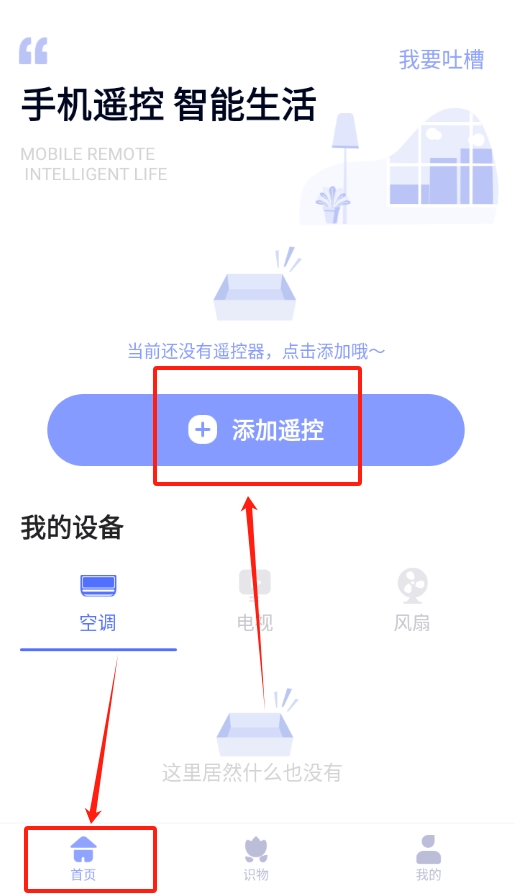 1、启动智能手机上的遥控器应用,在首页找到“添加遥控”按钮,点击该按钮进入添加界面。