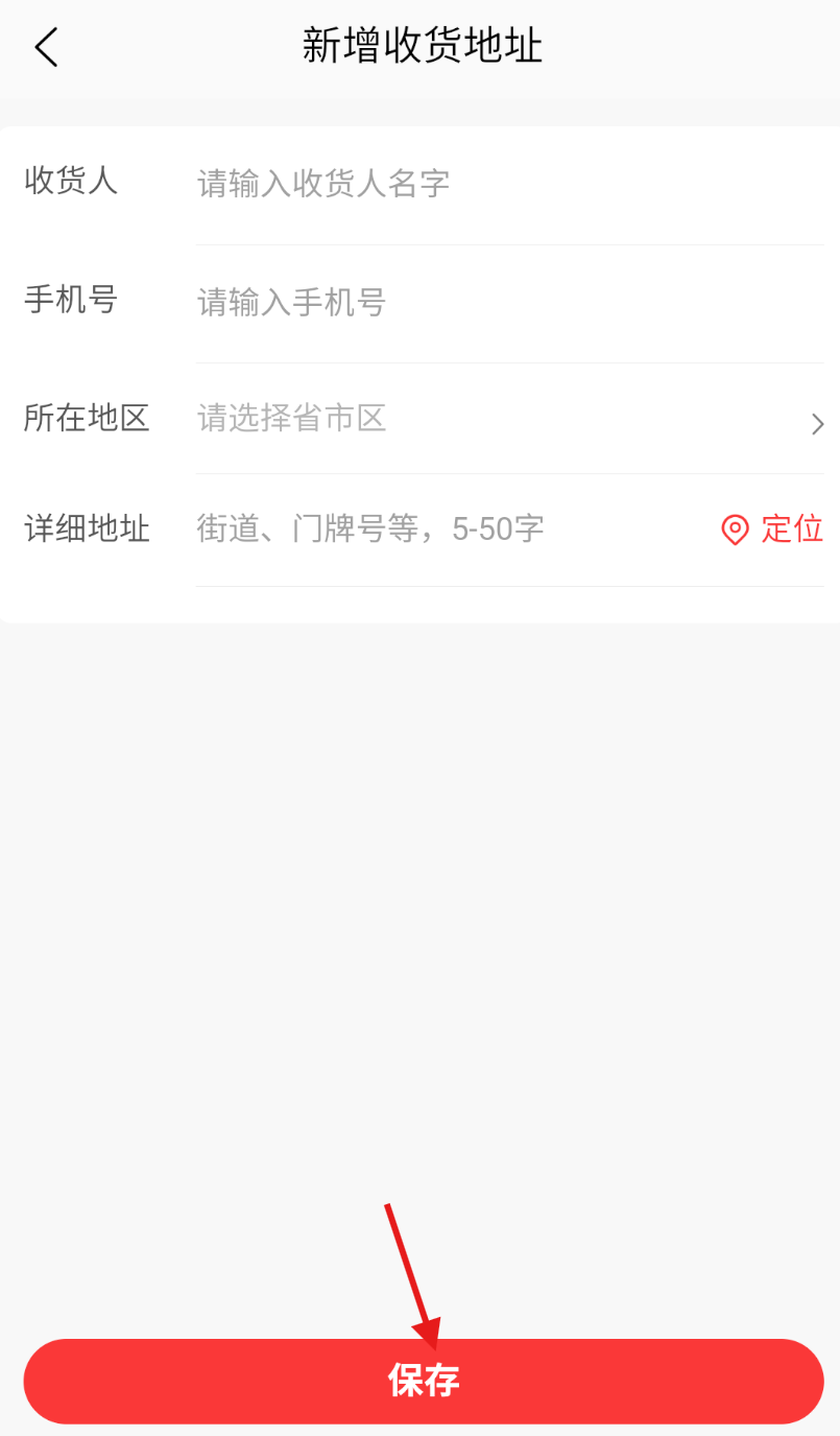 3、在收货地址页面点击“新增地址”按钮,即可进入地址信息填写界面。