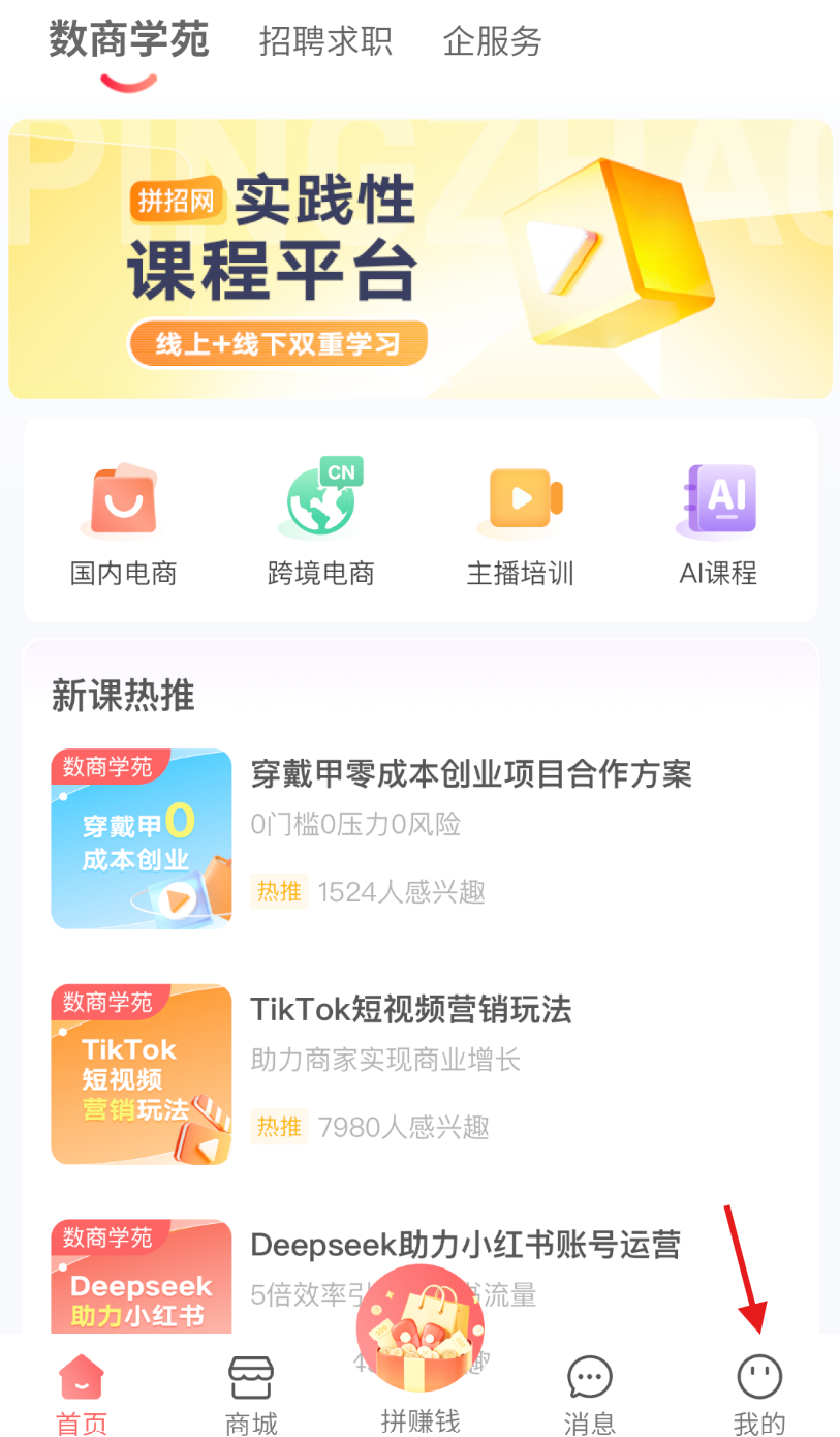1、启动拼招网应用程序,点击底部导航栏里的“我的”选项,进入个人中心页面。