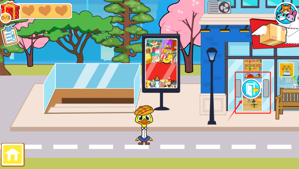 3、让小鸭子走到对面亮灯的店铺,点带加号的门进去。