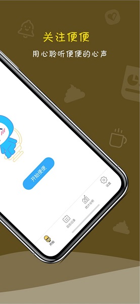 2、操作简单便捷:和跑步记录的操作逻辑相似,只需点击开始就能启动记录,设计了可爱的便便小人陪伴用户蹲厕,过程中还支持补充记录相关内容。