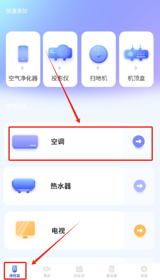 1、启动手机上的遥控器大王应用,在首页找到“空调”选项并点击进入。