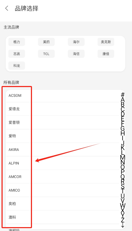 2、进入页面后,从列表里挑选自己家空调的品牌。