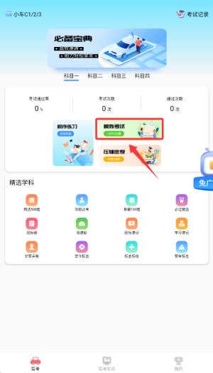1、启动驾考必备通后,在首页功能栏选择"模拟考试"模块,进入测试准备界面。