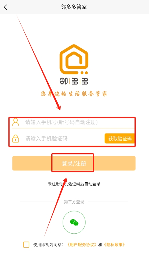 1、打开邻多多,在主页右上角找到未登录按钮,点击进入登录页面以准备注册。