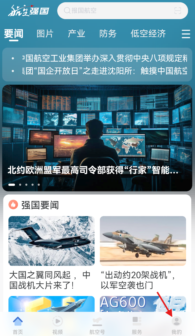1、开启航空强国应用,在软件界面底部找到“我的”选项,轻点进入个人中心页面。