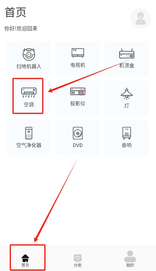 1、打开无线通用连接帮手软件,进入简洁明了的首页,在众多设备图标中,点击 “空调” 选项。