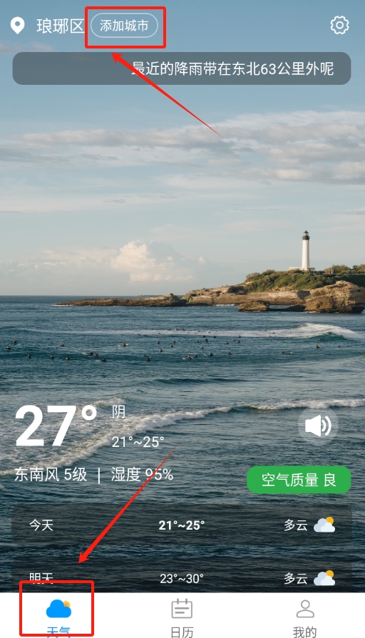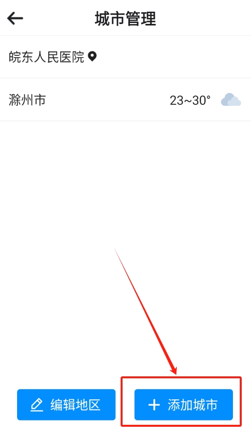 1、打开软件直接看首页,左上角有个添加城市的按键,点它就能开始操作了。