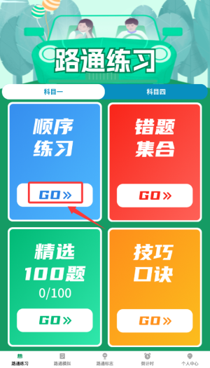 1、启动步步路通后,在首页功能栏选择"顺序练习"模式,进入题库训练界面。