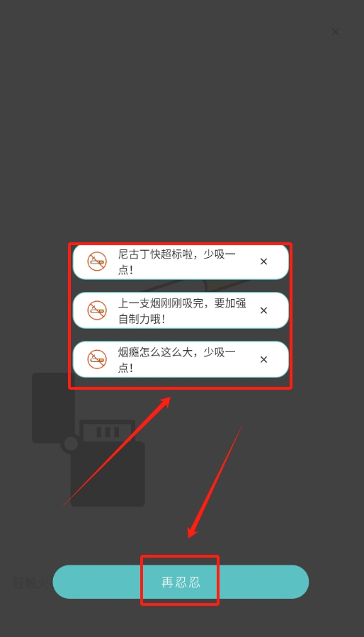 2、会弹出三个警示抽烟危害的牌子,把这些警示牌关闭后,接着点击“再忍忍”按钮。