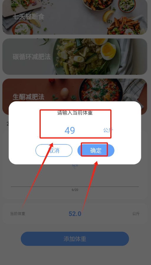 3、在弹出的输入框中填写体重数字,确认信息准确无误后点击确定按钮,即可完成记录。