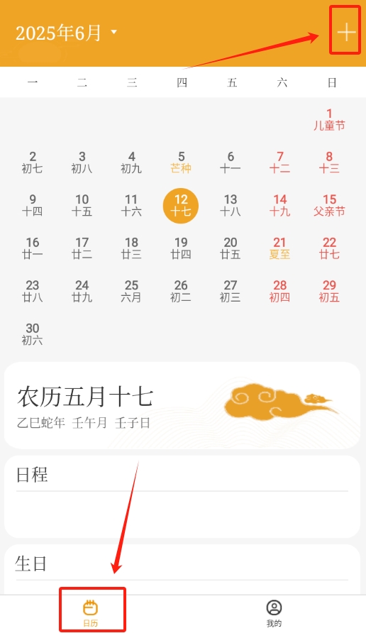 1、打开祥瑞日历软件,映入眼帘的是简洁的首页,在右上角能看到一个小小的加号,点击它。