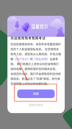 1、点击同意并进入应用界面,恪守相关使用条款,顺畅开启学习之旅,进入高效驾驶考试备考模式。