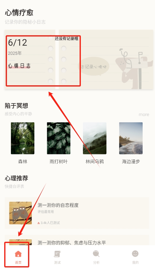 打开软件后,在首页找到“记录心情”按钮,点击进入即可开始记录今日心情。