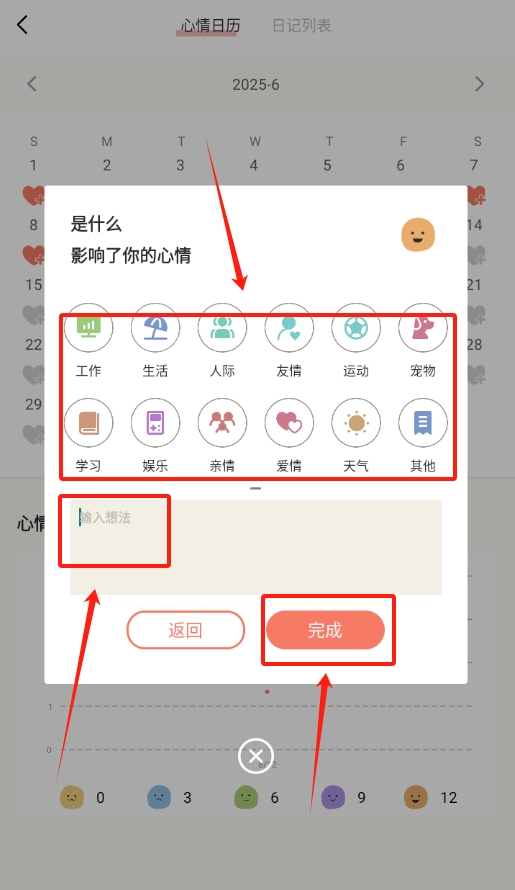 3、接下来选择导致心情变化的缘由,再把自己的想法填写进去,最后点击“完成”按钮,这样就记录好啦。