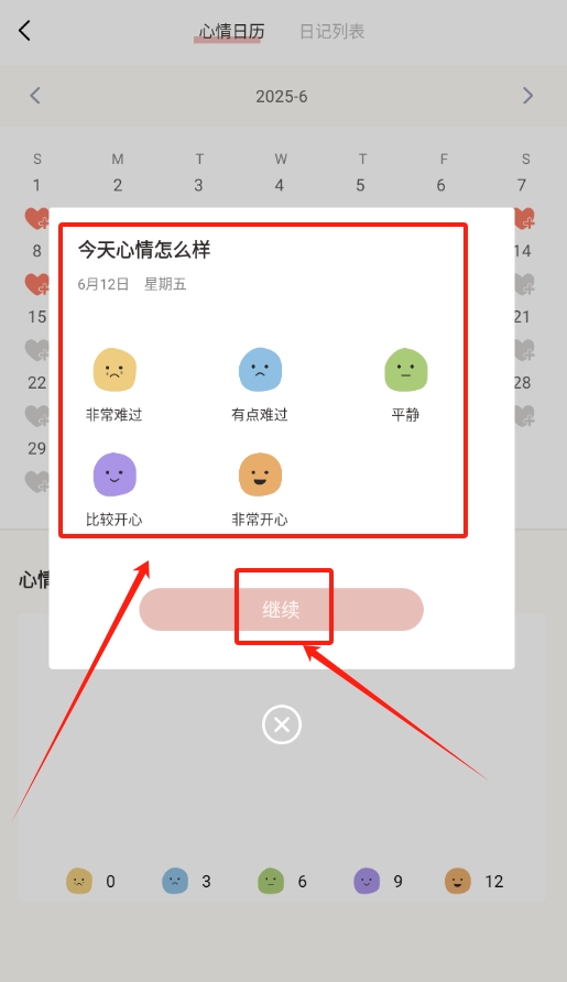 2、进入记录页面后,首先要选择今天的心情状态,像开心、难过或者烦躁之类的都可以。