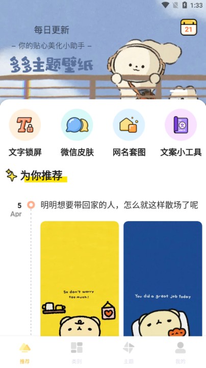 用户安装多多主题壁纸后,打开软件就能在首页浏览各类内容。