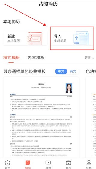 3、在开启的“我的简历”页面中,选择“导入”功能选项。